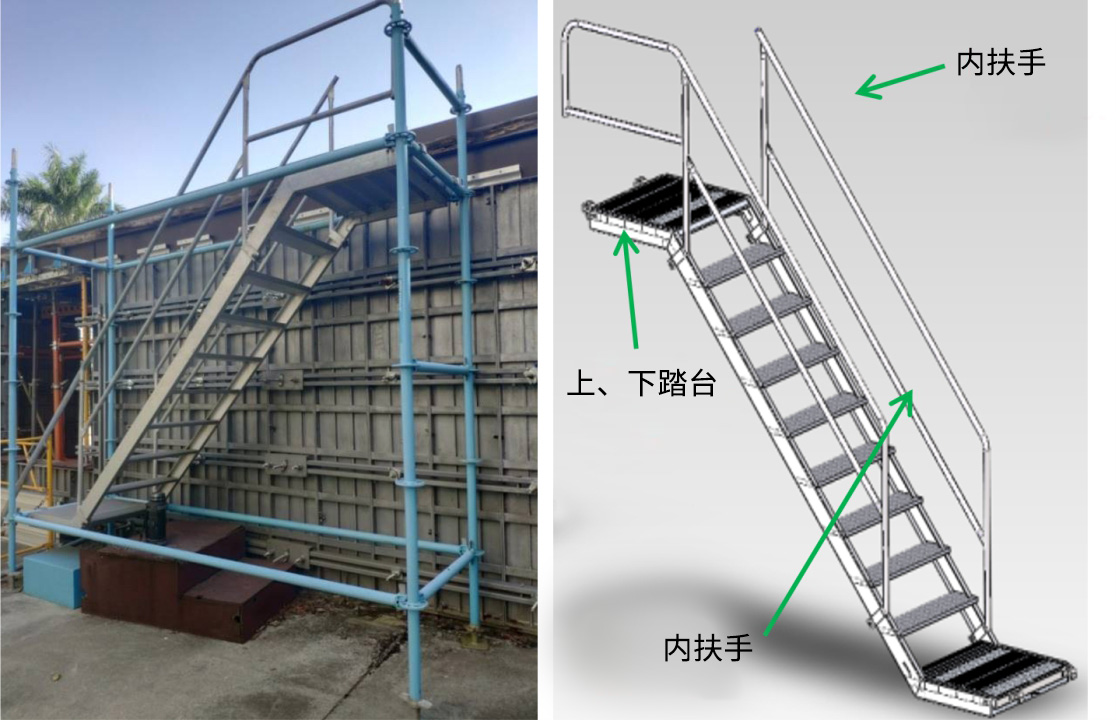 結(jié)構(gòu):梯踏臺(tái),梯腳踏板、側(cè)梁組合焊接型;+內(nèi)、外扶手組成。