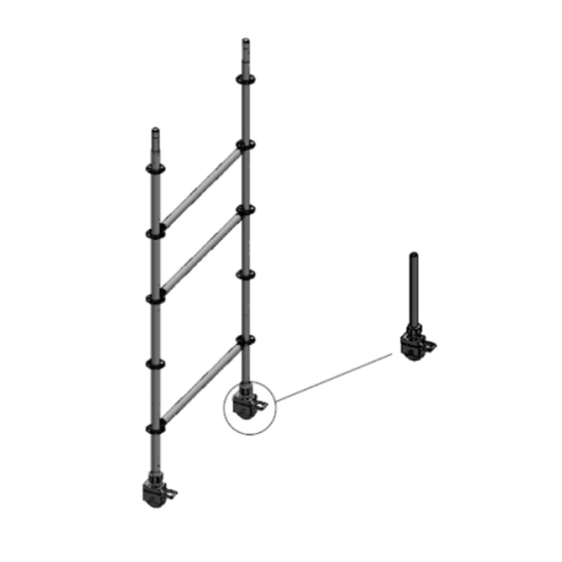 1. 腳手架塔須由至少2名工作人員操作。有關(guān)適當(dāng)培訓(xùn)的詳細(xì)信息,請與您的供應(yīng)商聯(lián)系。應(yīng)用制動(dòng)器,并將可調(diào)整的腳輪安裝到立柱管內(nèi)。 2. 將2個(gè)水平橫桿安裝在立柱的連接盤內(nèi)。參見放大視圖。