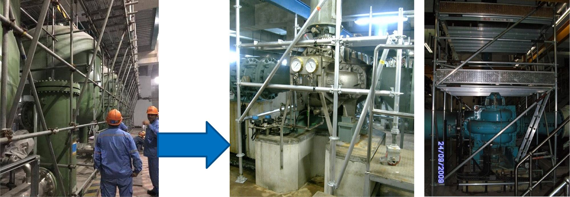 (B)在垂直框架的橫桿上安裝臨時(shí)工作平臺(tái)。